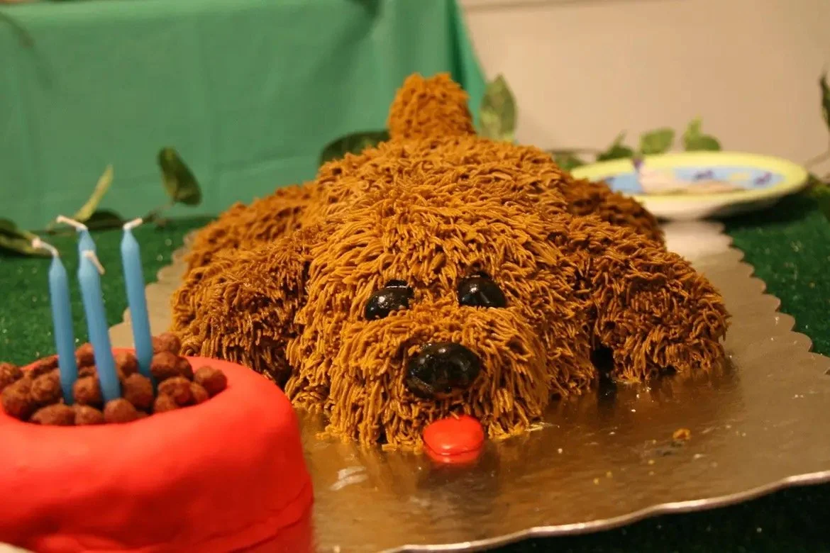 Yes, that’s a cake. What looks like fur is actually icing. The dog food bowl is also cake. I don’t know what that dog food is, but I am sure she made it, and it was edible. That gold surface it’s sitting on came from a special cake-making store, as did the candles in that particular shade of blue. The boys loved these special cakes, and their mom loved making them.