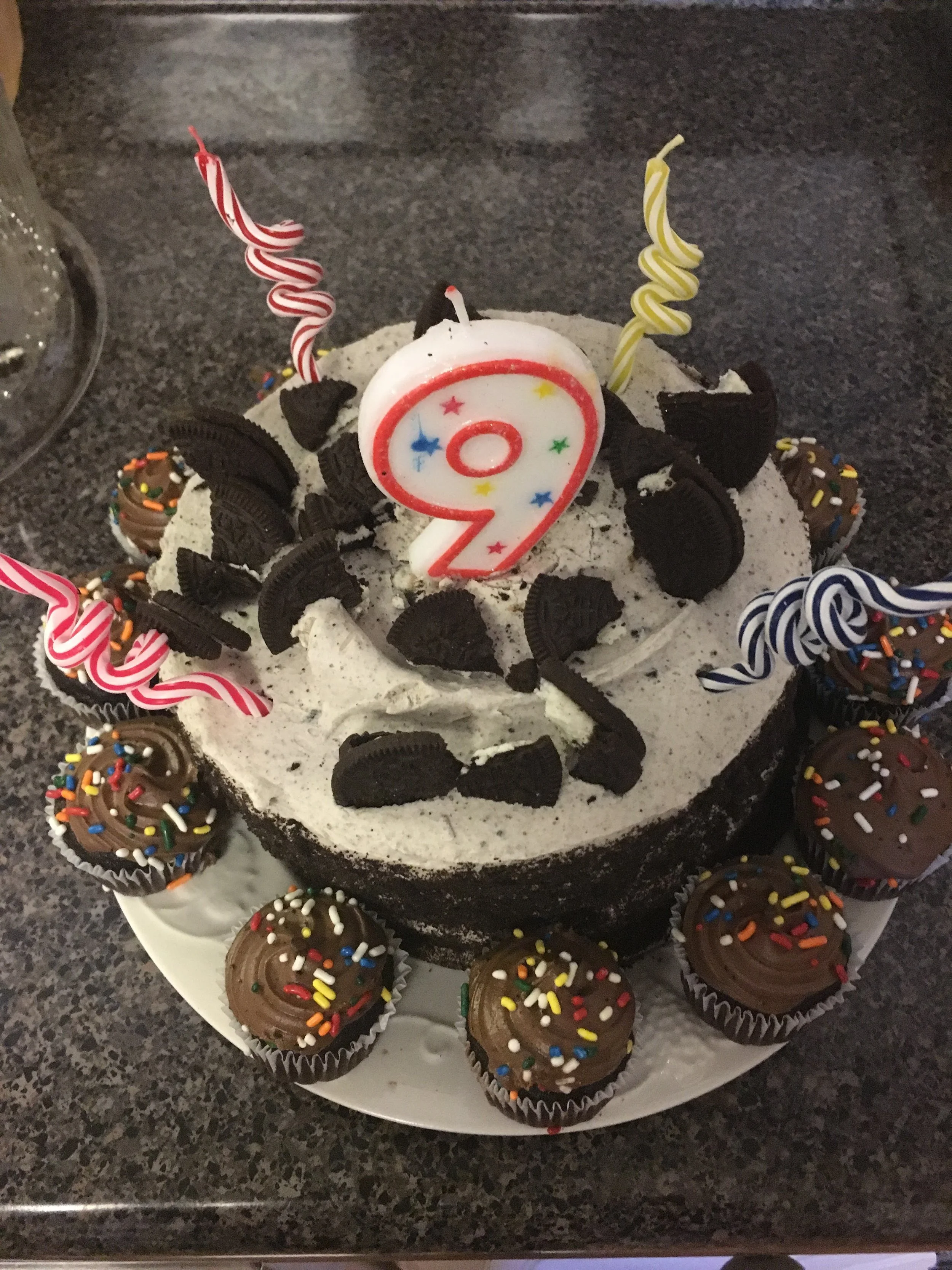 That is a store bought cake, surrounded by store bought cupcakes, with store-bought crumbled oreos on top. Those candles came from the same grocery store where I bought the cake. You’ll notice it is sitting on top of a plate, just a regular plate from my parents’ house. The birthday boy smiled and said, “I’ve never seen a cake like this.” And I said, “I don’t think there’s ever been one.”
